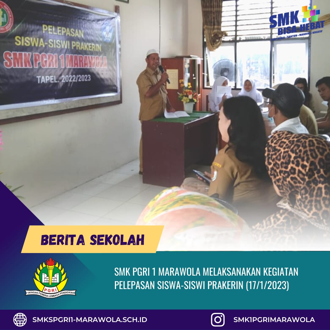 Selasa, 17 Januari 2023, kegiatan pelepasan siswa-siswi prakerin tahun ajaran 2022/2023 dilaksanakan di salah satu ruang pertemuan SMKS PGRI 1 Marawola. Praktek Kerja Industri (Prakerin) merupakan kegiatan pendidikan, pelatihan, dan pembelajaran bagi siswa SMK (Sekolah Menengah Kejuruan) yang dilakukan di dunia usaha atau dunia industri yang berkaitan dengan kompetensi siswa sesuai bidang yang digelutinya. Prakerin merupakan suatu kegiatan wajib yang harus diikuti oleh siswa-siswi kelas XI. Adapun pada tahun ini jumlah siswa-siswi yang mengikuti prakerin yaitu sebanyak 66 orang. Mereka berasal dari 3 jurusan yaitu, Teknik Bisnis Sepeda Motor, Teknik Kendaraan Ringan dan Teknik Komputer dan Jaringan.